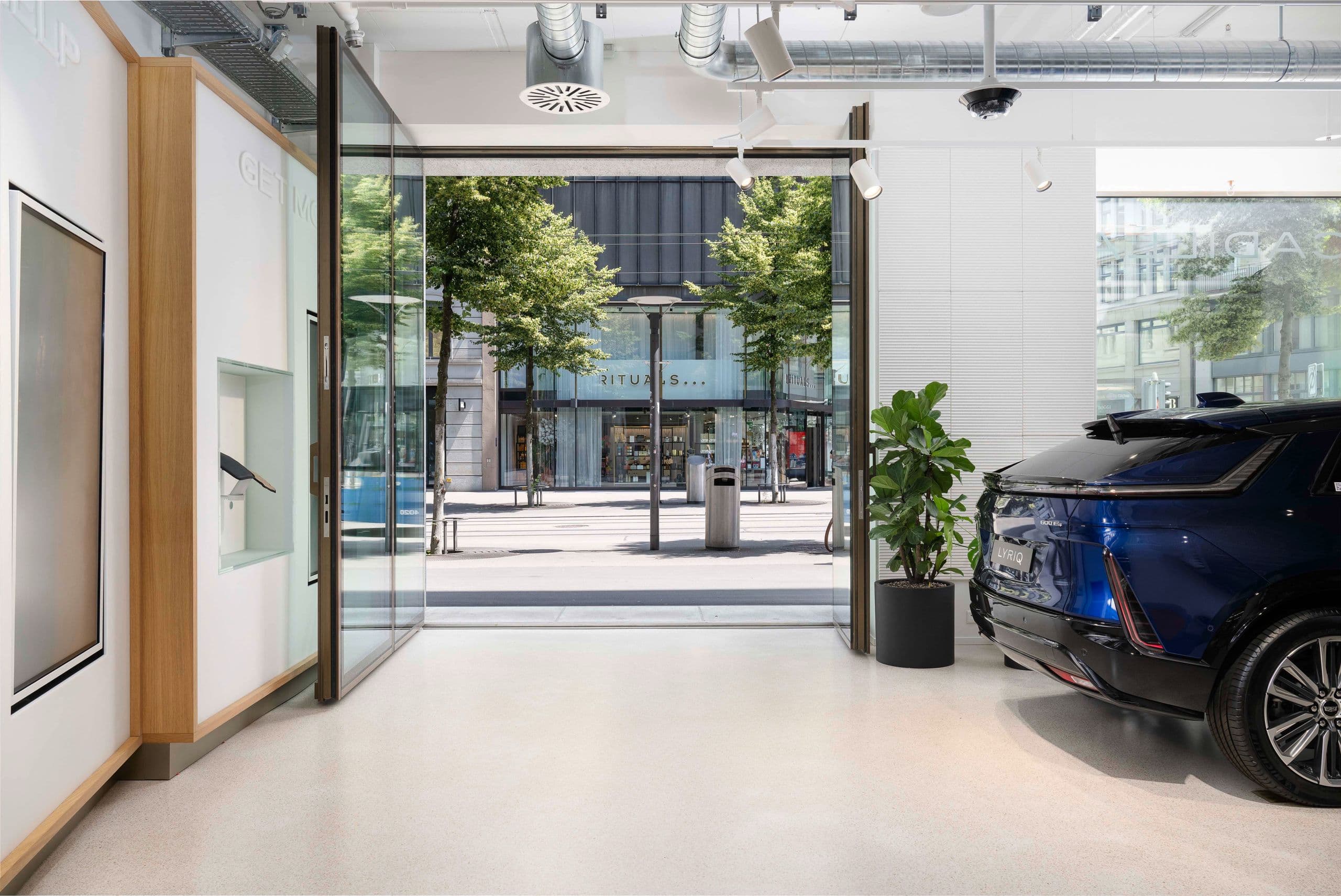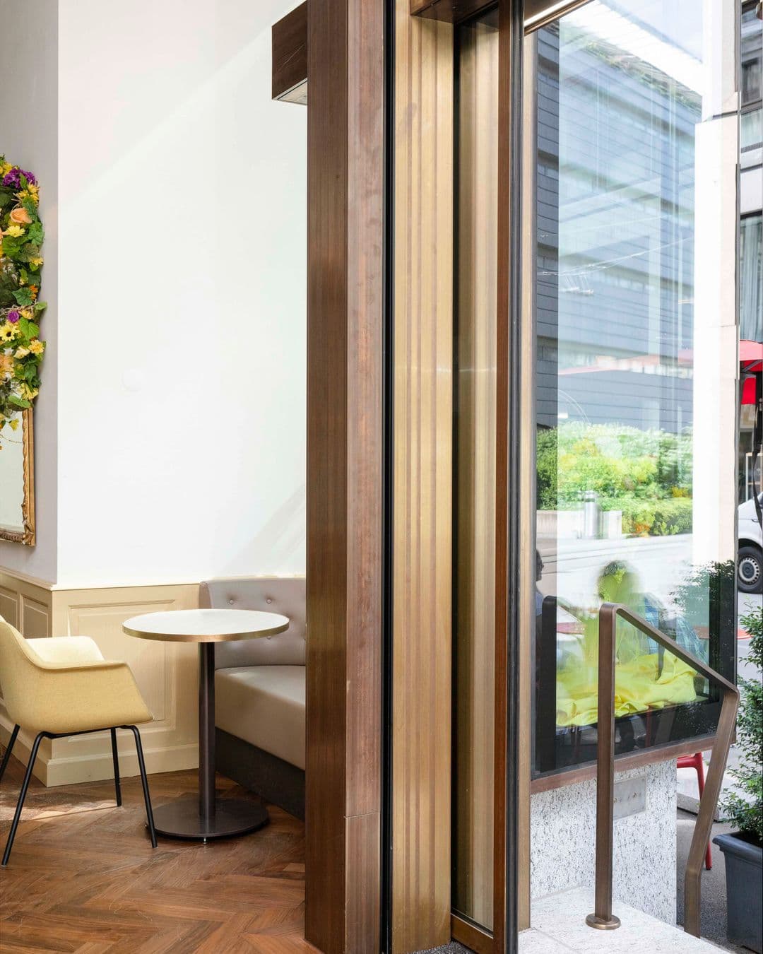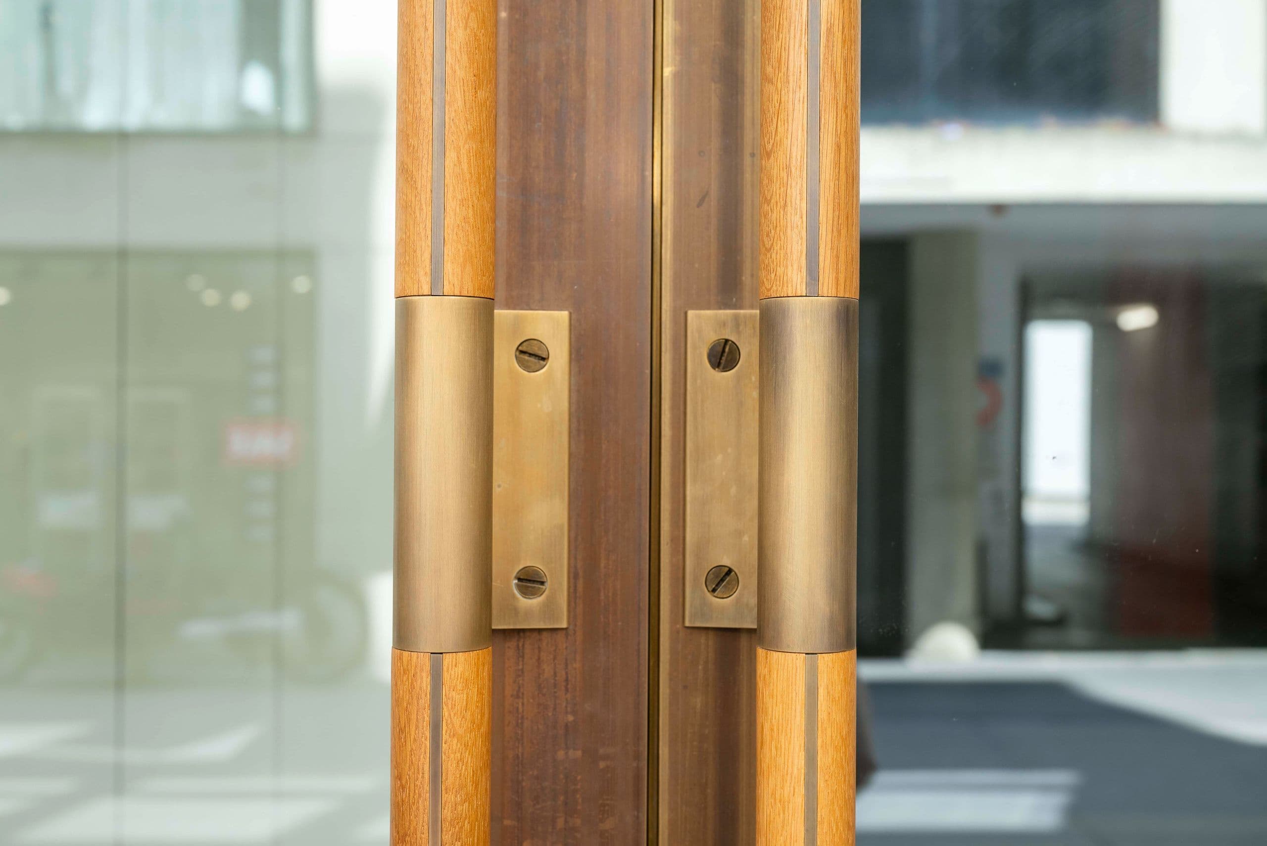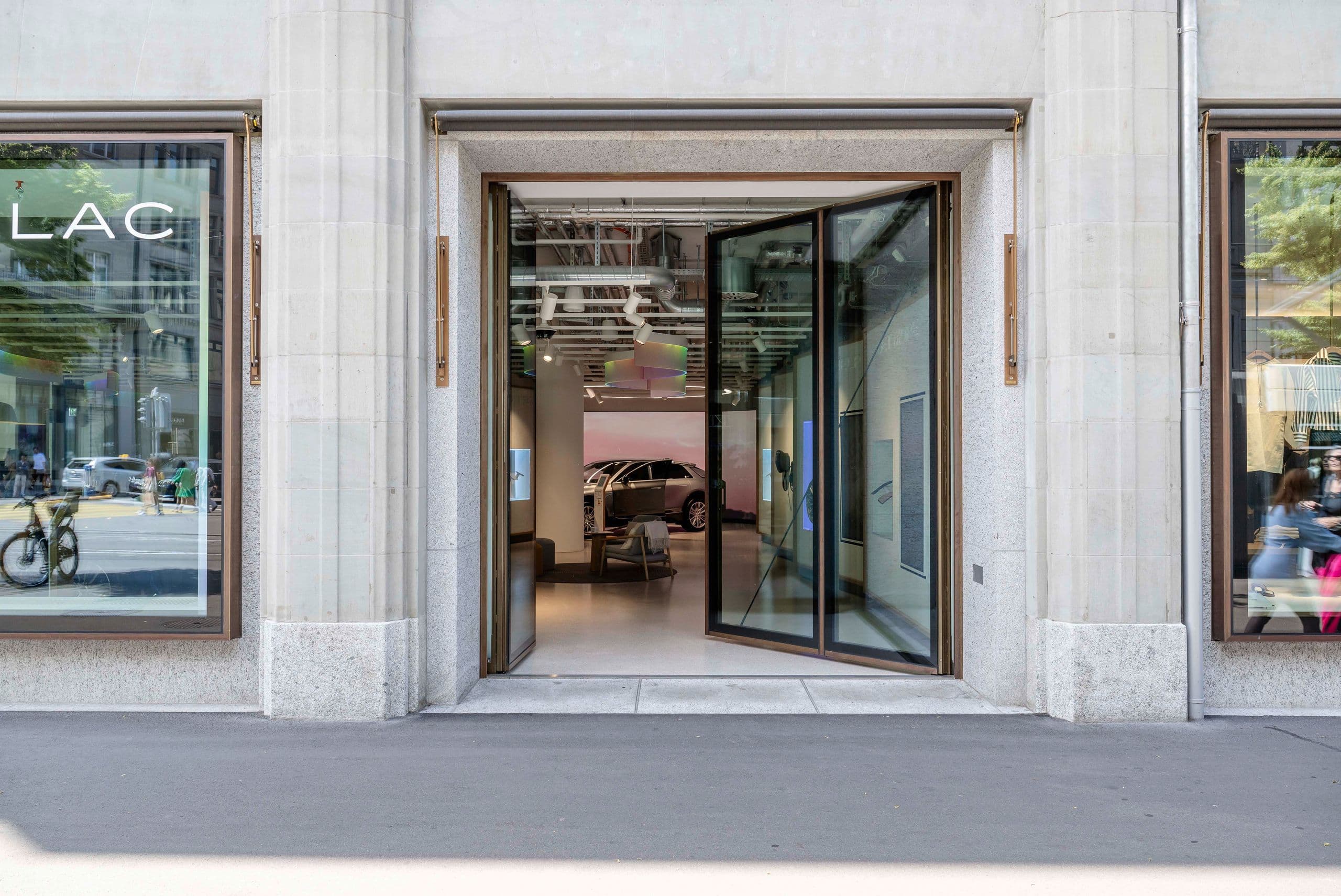 Baubronze vereint zeitlose Ästhetik mit einem hochwertigen Touch und ausgeprägter Langlebigkeit. Das Metall verarbeiteten wir zu Schaufensterrähmen, Türen, Geländer und zu einem Glastor für den General-Motors-Showroom. Beim Tor kombinierten wir Baubronze mit einer speziellen Glasfadenkonstruktion, dem Structural Glazing, die dem Eingang eine warme, edle Identität verleiht.