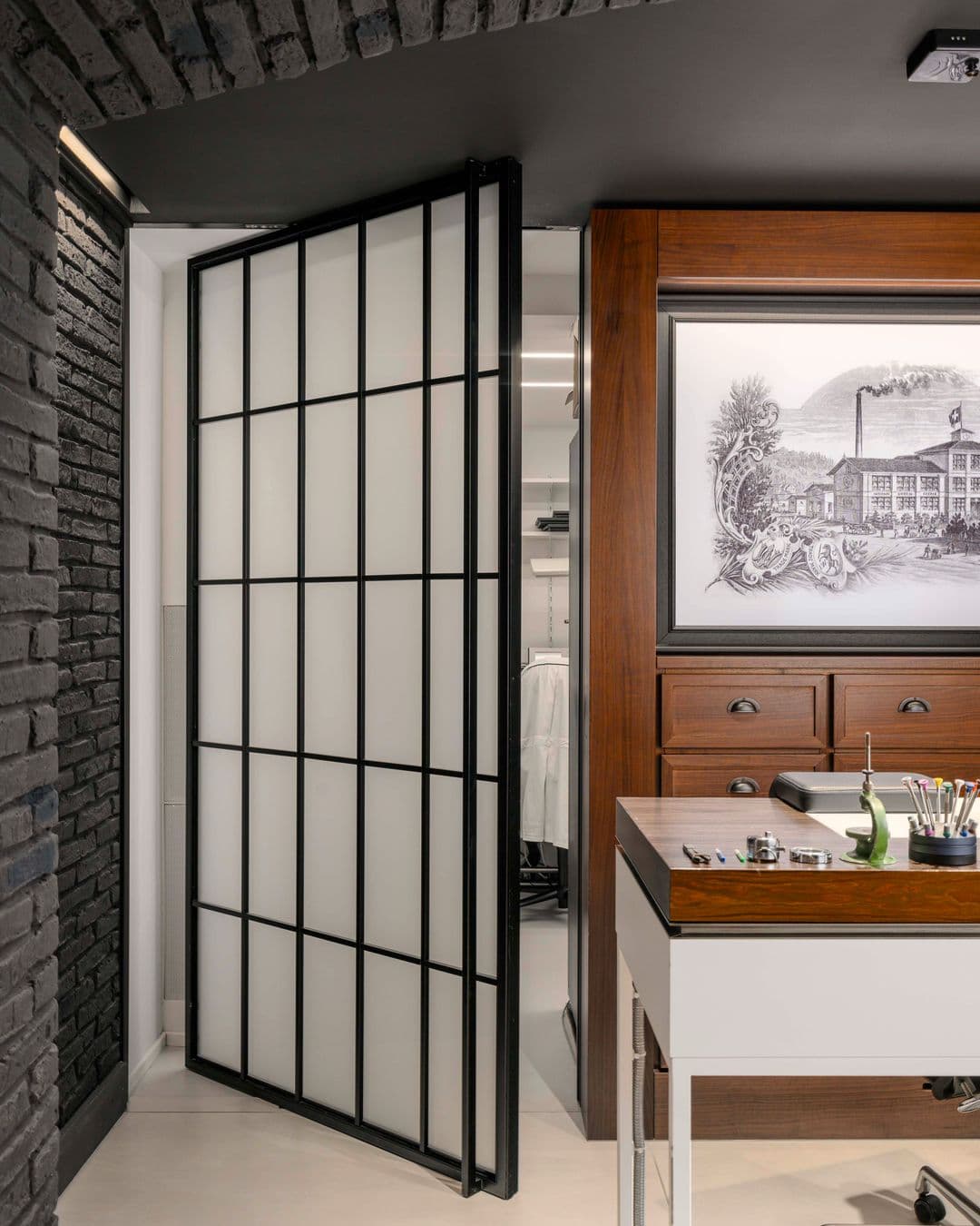 Wir realisierten eine Gestaltungs- und Konstruktionslösung, die stilvolles Design und hochwertige Materialisierung in sich vereint. Die Pivot-Tür mit ihrem charaktervollen Türgriff und ihren filigranen Streben sowie zahlreiche weitere charmante Details sind beispielhaft für unseren Sinn für die Interpretation und Umsetzung anspruchsvoller Kundenvorstellungen.