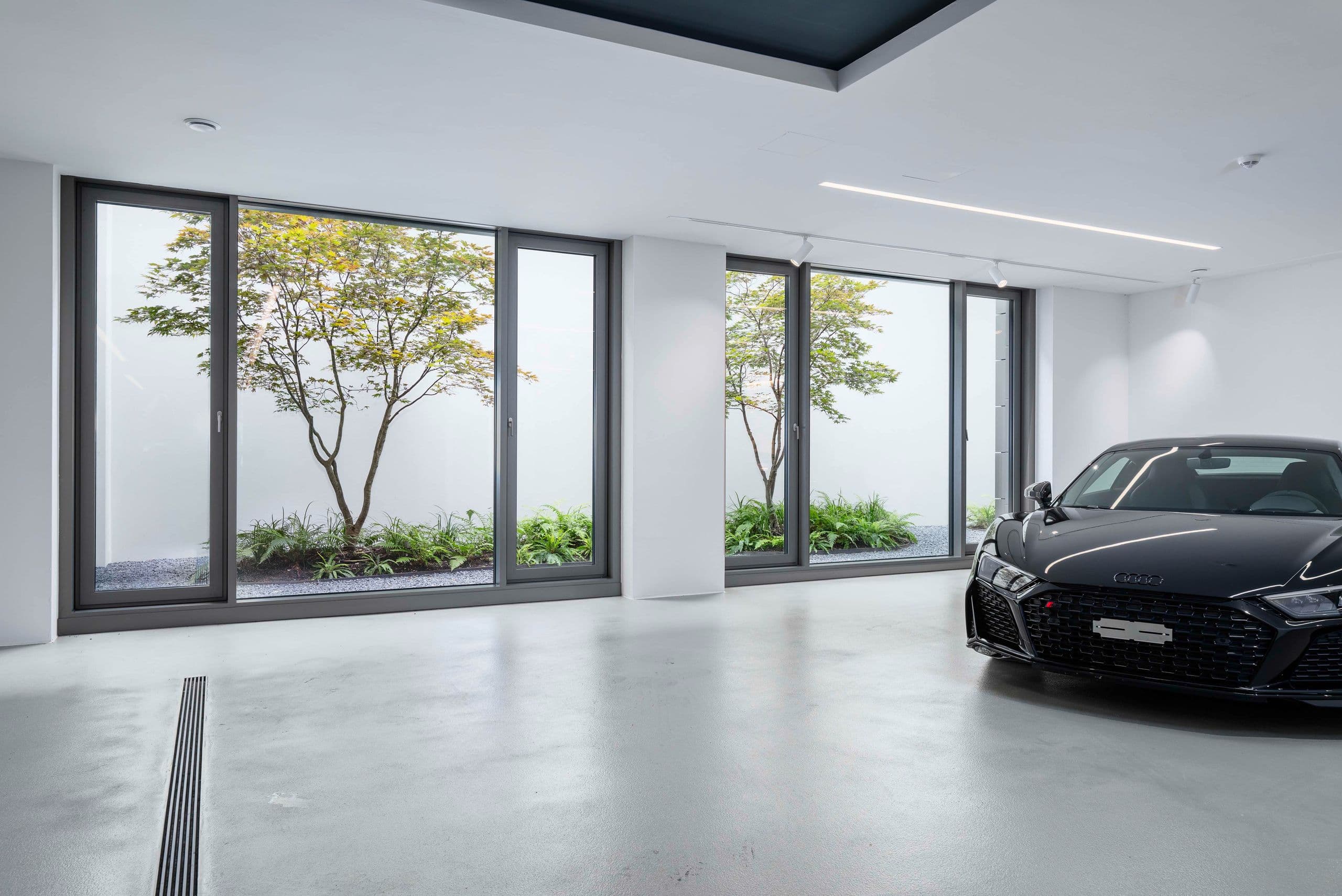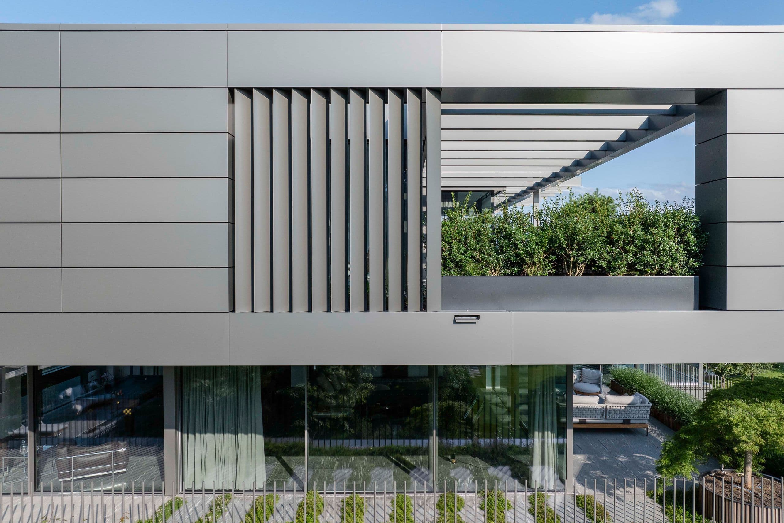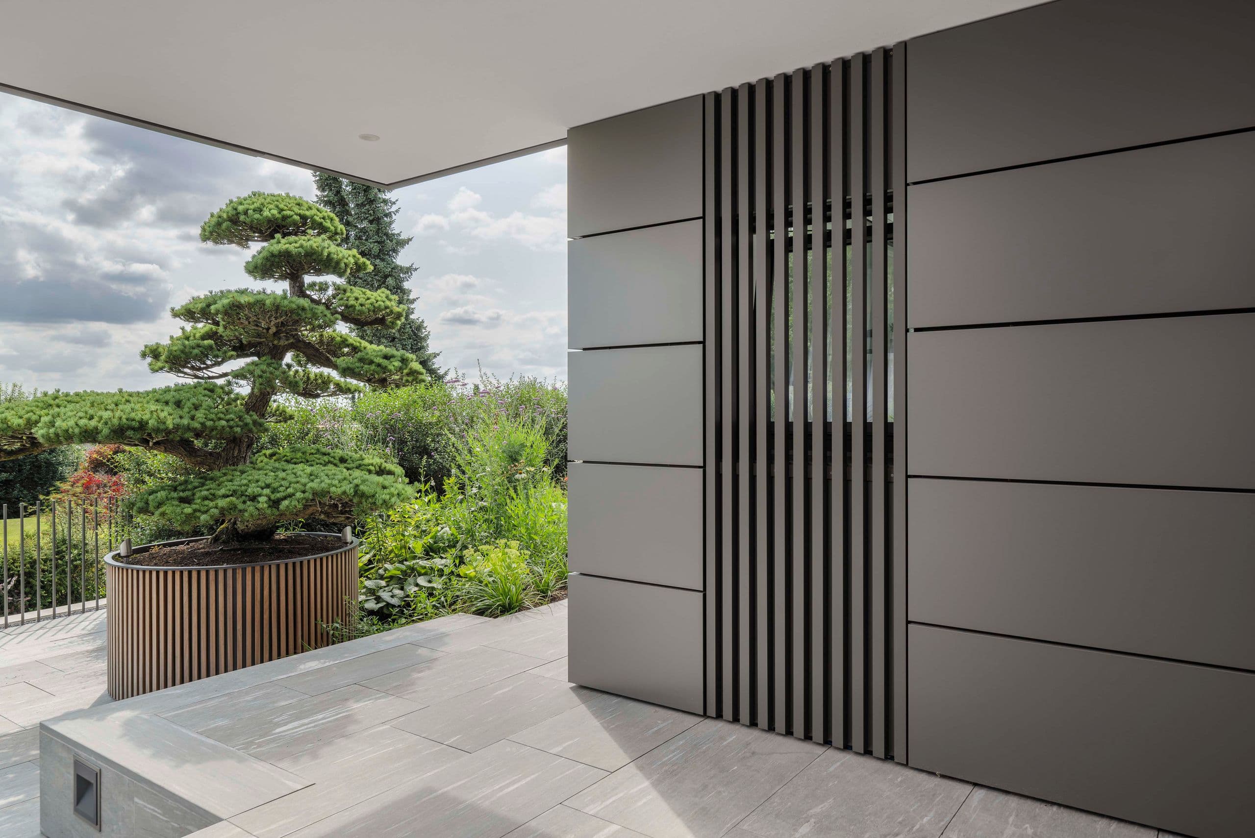 Die Fassade der Villa setzten wir mit einer hochpräzise gefertigten Alucobond-Aluminium-Verschalung um, welche der modernen, sachlichen Architektur zusätzlichen Charakter verleiht. Für die Geländer fertigten wir filigrane Metallstäbe, die luftig wirken und enorme Stabilität aufweisen. Das Garagentor wiederum ist ein flächenbündiges Schiebetor in minimalistischem Design und mit innovativer Funktionalität. Ein anspruchsvolles Projekt, das auch unser Können im Bereich Spezialanfertigungen unterstreicht.