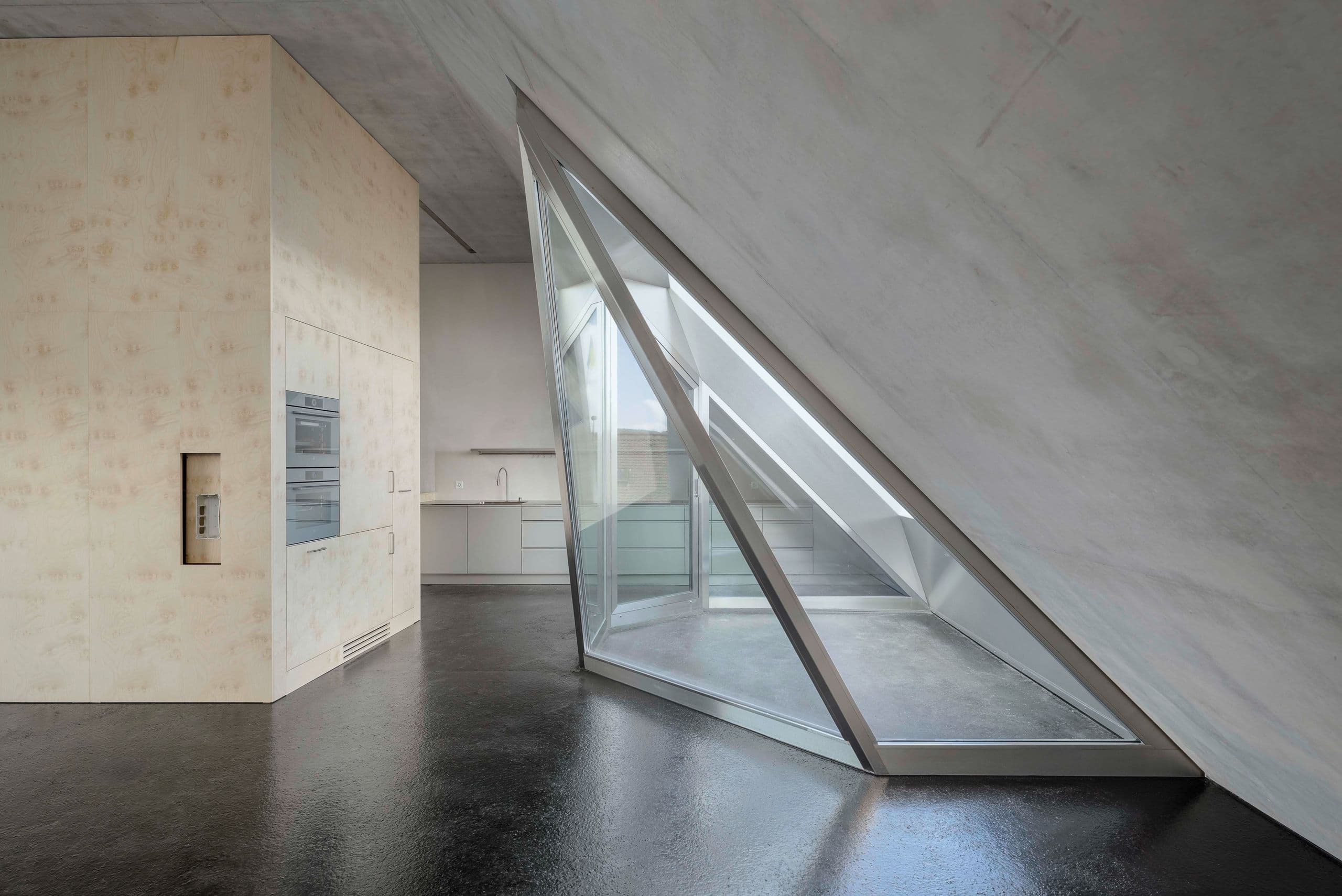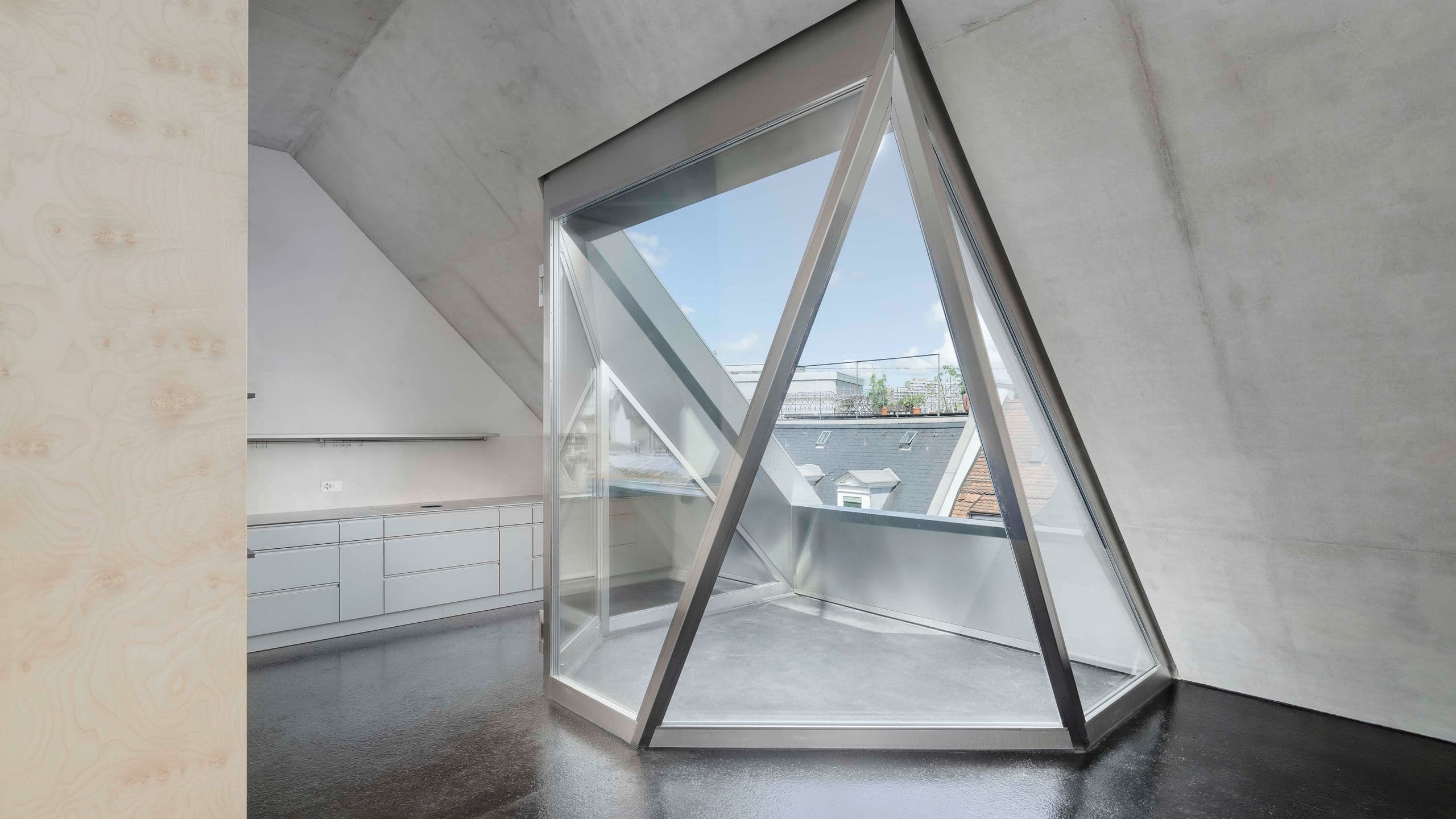 Das verwinkelte Raumlayout in Kombination mit viel Sichtbeton verschafft der exklusiven Wohnung ein hochmodernes Wohnambiente. Gefragt waren Fenster, die sich nahtlos in die spektakuläre Architektur einfügen.